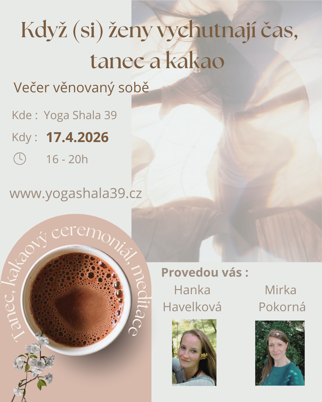 Co vás čeká: Intuitivní tanec s Hankou Havelkovou Ceremoniální kakao s Mirkou Pokornou